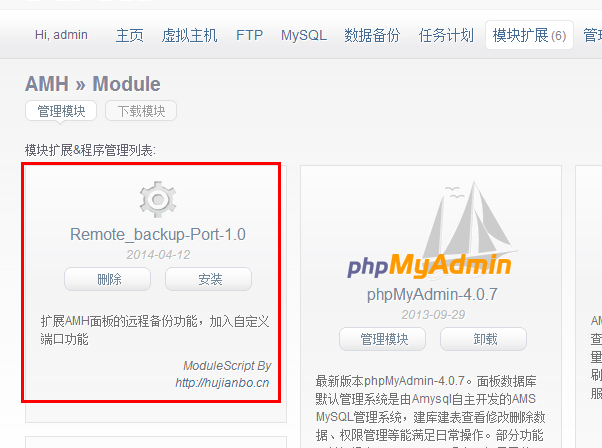 下载附件(Remote_backup-Port-1.0.tar),传到你的VPS,解压到/root/amh/modules/目录下。进入AMH管理面板,模块扩展--管理模块,找到Remote_backup-Port-1.0,点击安装按钮即可。